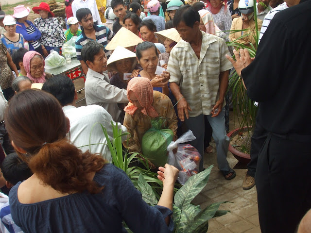 Nghe lời kêu gọi giúp đõ thì không thể từ chối và vì cũng muốn đi tới tận nơi xem một lần cho biết, chúng tôi thuê một xe 16 chỗ ra đi từ Bình Giả lúc 5h30 sáng và tới nơi lúc 10h30 trưa. Vì đã báo trước nên bà con tụ tập tại đây khá đông để nhận quà, mỗi phần quà là 10kg gạo và 15 gói mì tôm, họ có vẻ sung sướng lắm. Tại đây, chúng tôi gặp đoàn anh em ở xã Bình Trung, phái đoàn xã Phước Tỉnh và phái đoàn Suối Nghệ cũng đáp lời mời của cha, quà gồm có quần áo với mì tôm, tiền ủng hộ và tiền xin lễ.